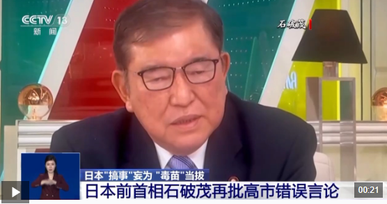 针对日本首相高市早苗的涉台错误言论,日本前首相石破茂23日提出批评。他表示,在外交问题上,不能只停留在口头上。希望高市内阁记住。 此前,石破茂13日在广播节目中对高市的不实言论表示反对。 (总台记者 何欣蕾)