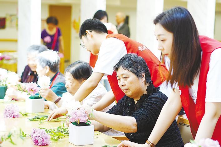 咸宁市咸安区中医医院医疗护理中心的老人参加插花活动。 (湖北日报通讯员陈晓红 摄)
